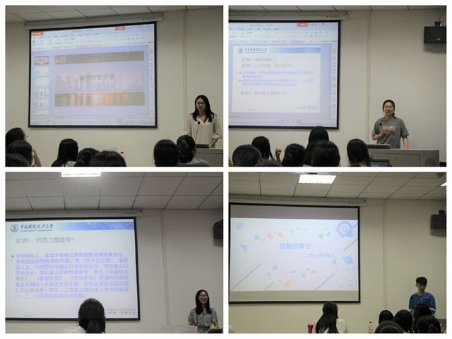 新闻网讯(学生记者 何湘琦 摄影 何湘琦)为了更好地帮助学生规划大学、规划职业, 2019年6月4日晚7点,城管1701班在文泉北203教室举行了“保研、考研、出国、就业”经验分享班会。班会邀请了2017级研究生李星颖、已保研至浙江大学的城管1501班学生顾贾能、成功申请到新加坡国立大学的城管1501班学生魏梦月以及已签约OPPO的城管1501班学生王豪杰,分别就考研、保研、出国、就业四个方面为城管17级学生做经验分享。班会由辅导员黄勤老师主持