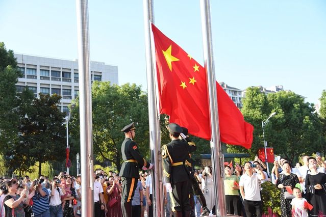 随后,新中国同龄人、我院70岁退休教授蔡放波与其他五位师生代表在国旗下深情朗诵,告白祖国。“五星红旗迎风飘扬,胜利歌声多么响亮,歌唱我们亲爱的祖国,从今走向繁荣富强……”师生朗诵结束后,校领导及各学院、各民族师生代表齐唱《歌唱组国》,用激昂的歌声表达对祖国爱。