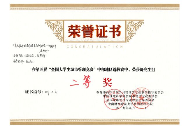 (通讯员 赵颖智)为进一步提高城市管理及相关专业教学水平、培养学生关注社会问题的职业素养,教育部高等学校公共管理类专业教学指导委员会、中国区域科学协会城市管理专业委员会于2019年举办了第四届全国大学生城市管理竞赛。第一轮选拔赛在华北、中部、西南等多个赛区进行,我院两支队伍在中部地区选拔赛中脱颖而出,其中由赵颖智老师指导、黄少春同学完成的作品《城市双修背景下武汉市城市公园类型、功能及布局优化探究》荣获研究生组一等奖,由孔凡义老师指导、徐张欢和孙梦琦同学完成的作品《基层信访的责任传导机制研究——以湖北省J县为例》荣获研究生组二等奖,顺利入围全国总决赛。