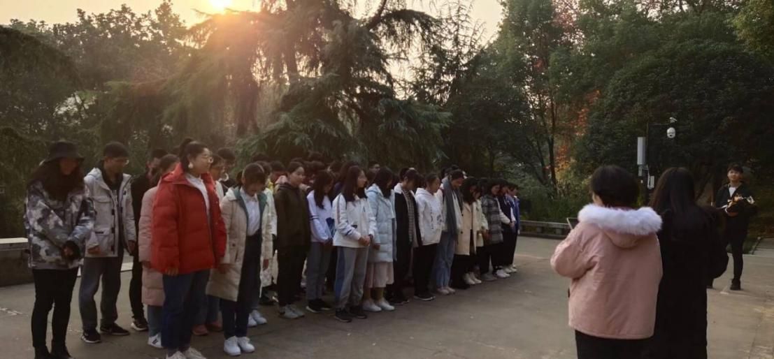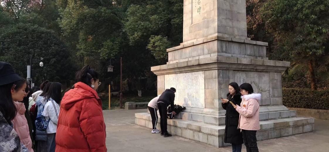 沿着落叶缤纷的曲折小道继续向里走,经过武昌起义第一枪纪念石像,来到了革命纪念广场。广场中央是以武昌起义人物为主的大型石雕和花坛,环境优美,文化与休闲并重,同学们于此处自由活动,拍照留念。