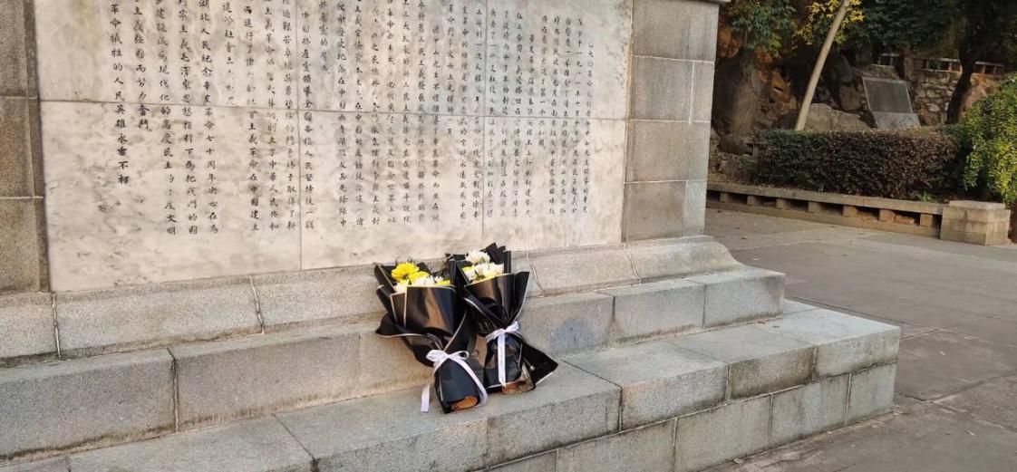 在充分休息调整后,班委组织大家于纪念碑下站定。透过革命纪念碑,我们仿佛看到革命先烈浴血奋战的不息身影,面对昔日的民族英雄,同学们心中千言万语难以诉讼,集体低头默哀,以示崇敬之意。彼时微风阵阵,我们感觉到的却是一缕缕庄严而肃穆的氛围。两班班长上前献上了绽放的秋菊,团支书深情朗诵着纪念词——