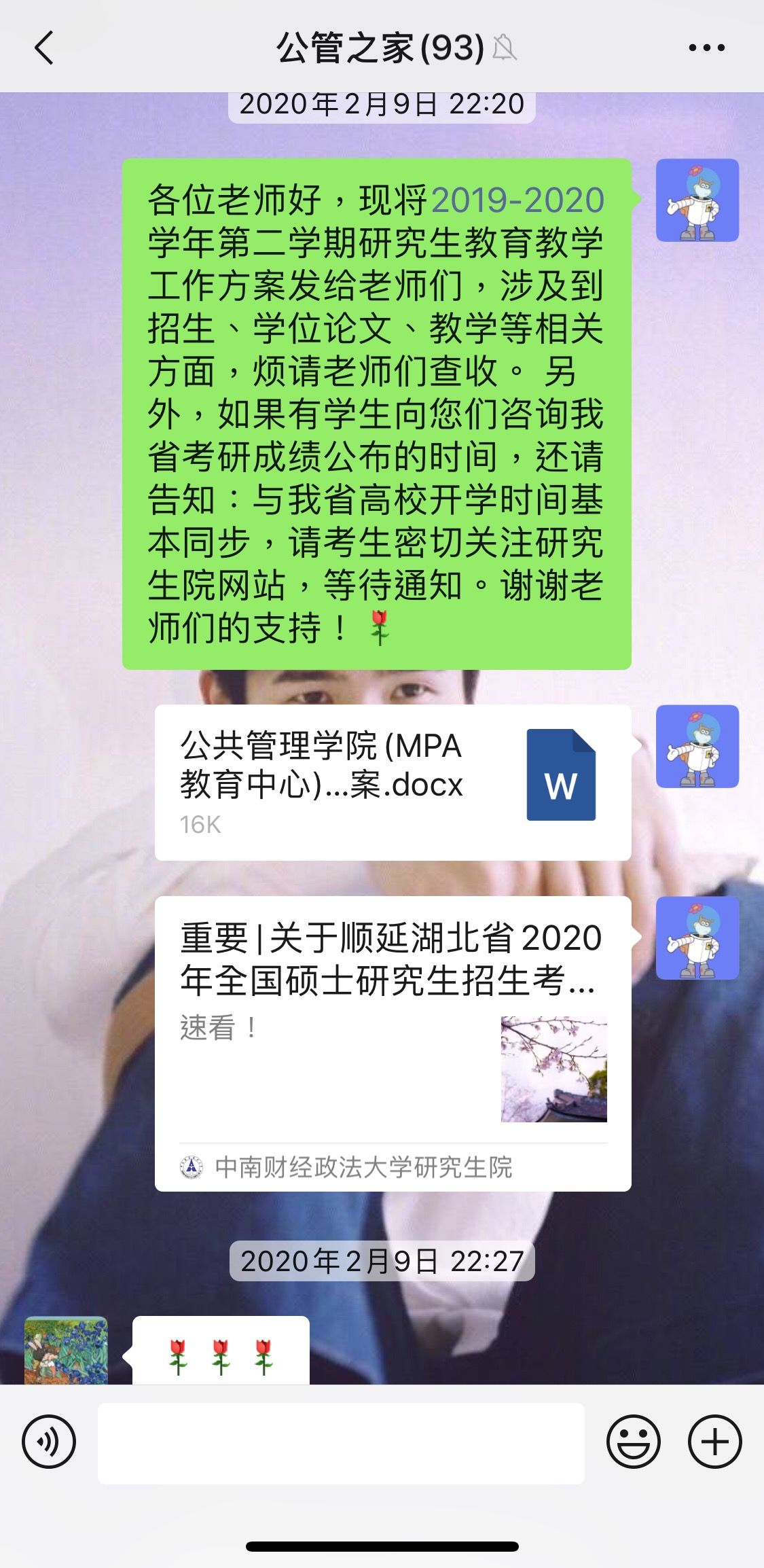 特殊疫情防控期间,公共管理学院全体教职员工群策群力,在武汉之外的老师们也都克服了网络及设备不便的困难,全体教师实现了线上教学不停学的全覆盖。大家共同期待着尽快战胜疫情,相信重返校园之日会尽快到来!