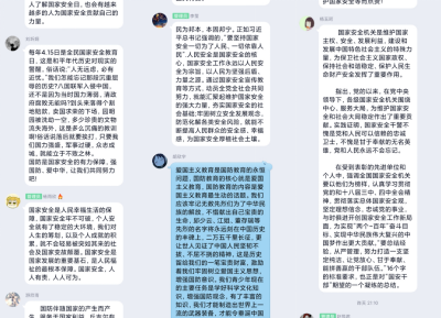 公管1904班的这次线上讨论,更有多位同学结合青年大学生的特殊身份以及青年的责任和使命,给出了不一样的思考。公管1904的杨玉珂表示,我还记得高中曾经学过这样的知识:国家安全机关是维护国家主权安全、发展利益、建设和发展中国特色社会主义的特殊力量,为保卫社会主义国家政权,保持社会和谐稳定,保护人民生命财产安全发挥了重要作用。当今在面临新冠肺炎疫情以来,在党中央的领导下,各级国家安全机关围绕中心、服务大局,为维护国家安全和社会大局稳定作出了重要贡献。事实证明,国家安全是一个国家的人民必须重视、必须关注的问题。而我们作为新时代的中国青年,更要对国家安全问题予以更多的关注,尤其在教育、文化、科学技术等软实力层面的因素,要用自己所学到的专业知识,维护国家安全。