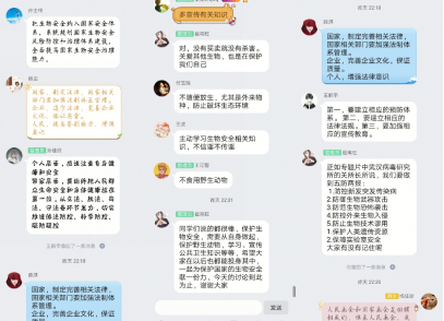 公管1905班的同学们在观看直播的同时,结合课上老师讲过的内容展开了气氛活跃的讨论。班长樊成刚表示,说到底,国家安全体系的建立,不论是哪方面的努力建设,归根结底都是为了保护公民的切身利益。所以我们作为人民群众,更需要积极响应政策,做好我们自己应该做的,就是在保护自己。而关于生物安全,很多植物的疫情也会影响到自身的产量,以及相关地区的生态环境,比如大家高中学习到的烟草花叶病毒等。熟悉的病毒需要妥善处理,未知的病毒需要及时预防,而且动植物之间的疫情可能是会出现交叉感染的,所以大家更需要注意远离野生动物了。