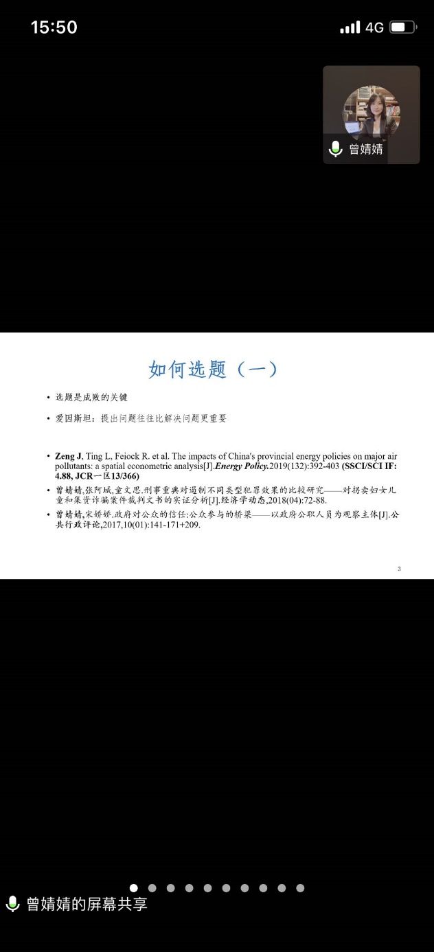 在主题党日学习的基础上,相关业务学习也同步进行,以实现“两手都要抓、两手都要硬”的目标。曾婧婧同志和李云新同志分别围绕着“响应国家重大需求、申请科研项目”以及“以育人为中心、指导学生开展读书会”等主题进行经验分享。新疆财经大学公共管理学院张金玲同志和刘芳同志结合自身经验,与大家交流了如何在“课前、课中、课后”开展教学活动,做好“线上”与“线下”教学的衔接工作。随后,双方教师就如何更好的开展科研活动、改善网络教学效果进行充分的讨论,并表示从联合主题党日学习中获益匪浅、举办类似活动很有必要。