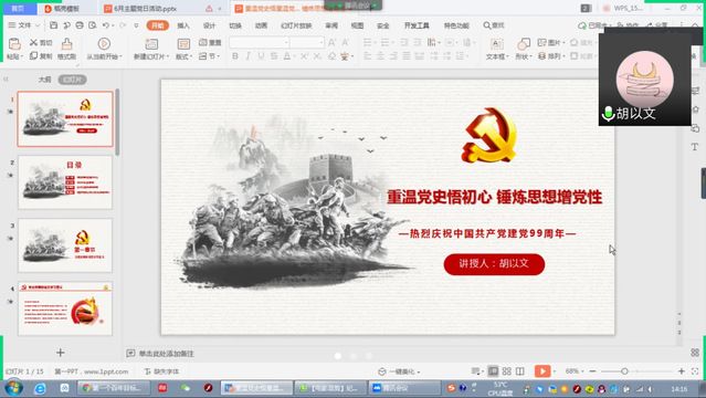 6月26日,研究生1902党支部开展6月主题党日活动,本次线上党日活动分为三部分,首先阐述习近平总书记在两会期间的重要讲话;其次讲解2020年政府工作报告;最后是共同分享习近平总书记的青年寄语。支部书记胡以文带领大家进行“重温党史悟初心 锤炼思想增党性”的微党课学习,号召支部成员认真地学习、吸取和借鉴党史的智慧,切实提升自身素质。