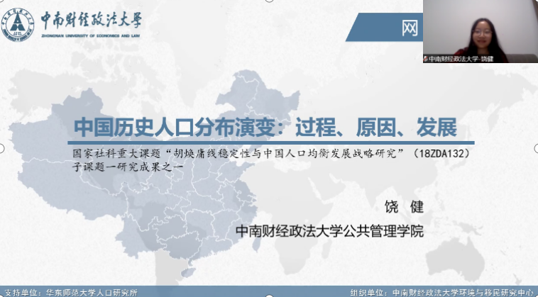 饶健博士报告的题目是《中国历史人口分布演变:过程、原因、发展》。她首先介绍了对历史人口分布变迁进行深入研究的历史意义以及其对当下的借鉴意义。随后,她依次对原始社会和奴隶社会、封建社会、半殖民地半封建社会、社会主义社会等各个历史阶段的人口地理演变过程作了详细介绍。指出了在不同历史阶段,人口分布变动的趋势和特征存在差异,人口变动的主导因素也不同。并在此基础上对历史人口分布演变进行总结,并提出对当今及未来人口演变分析可借鉴的相关经验。基于以上分析,饶健博士提出在当今时代发展要求下,需要把握当今社会面临的新变化、新机遇,尤其关注如信息化和全球化等可能会对人口分布格局带来影响的新因素。