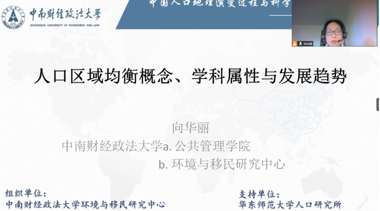 向华丽副教授报告的题目是《人口区域均衡概念、学科属性与发展趋势》。她首先介绍了人口区域的内涵以及当前国内外的研究背景,指出当前的人口均衡主要是人口的系统均衡,一方面强调人口自身的内部均衡,另一方面则强调人口与资源和环境协调发展的外部均衡,而人口区域均衡是区域或地理空间层面研究的人口均衡。并指出人口区域均衡是我国将可持续发展融入国家发展计划以来从人口维度提出的发展要求。随后向华丽副教授指出了人口区域均衡是属于人口地理学研究范畴的学科属性,并详细介绍了国内外人口地理学科的发展历程以及胡焕庸线与人口区域均衡的关系,人口区域均衡是在可持续发展目标的基础上对胡焕庸线的突破性与稳定性的进一步研究。最后,向华丽副教授提出了人口区域均衡未来可能的研究方向,主要包括城市的人口合理规模、城市人口实时分布规律、区域间人口流动或迁移预测分析、气候变化背景下人口分布与适应各种预测场景分析、以及包括人口规模在内的其他人口属性在空间上的分布规律等。