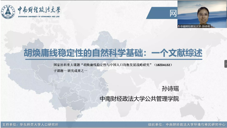 孙诗瑶博士报告的题目是《胡焕庸线稳定性的自然科学基础:一个文献综述》。她首先介绍了胡焕庸线稳定性自然科学基础研究的研究背景和研究目的,胡线稳定性的自然科学基础研究有利于我们了解自然因素对人口分布的影响以及正确认识胡焕庸线长期稳定的自然科学基础。随后,她就地貌、气候、自然资源、生态环境等自然因素对人口分布的一般规律作出详细介绍,并从人体生理机能、人类生产活动、人口迁移、人口分布的路径依赖等四个方面来解释了自然因素影响人口分布的作用机制。基于以上分析,孙诗瑶博士得出了自然因素对人口分布有基础性影响的结论,胡焕庸线体现的中国人口分布特征在长期中具有稳定性,这种稳定性建立在自然科学基础上,是自然环境基础、社会经济因素和历史因素共同作用的结果,符合人口分布的规律。