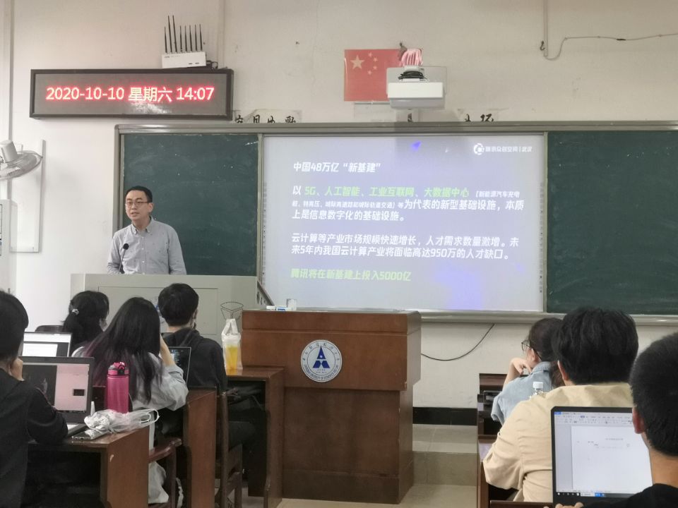 (湖北省人文社科重点研究基地——创业与就业研究中心 网讯)2020年10月10日下午,国家级众创空间腾讯众创空间(武汉光谷)创建者与运营总经理肖承在文澜楼102教室和同学们进行了题为“数字新基建与创新创业发展趋势”的交流。