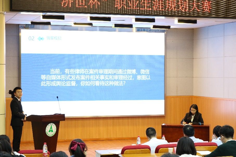 本次大赛分为风采展示以及情景模拟两个环节。在风采展示环节,十位选手借助职业测试量表分析个人性格与优势,确定最适合自己的职业选择。法1914班的俞琳通过MBTI职业性格测试确定自己的职业规划:成为一名专职律师。确定职业目标后,各位选手就如何达成目标展开详细介绍。选手们目标规划清晰,时间把握得当,叙述语言坚定。