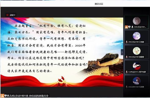 新闻网讯(摄影 贾璇 王继徽 记者 崔海旺)2020年11月21日下午2点,中国石油大学(北京)克拉玛依校区文理学院会计1902团支部和我院劳动1901团支部联合开展的“学总书记回信精神,谱新时代青年新章”主题团日活动在腾讯会议准时召开。