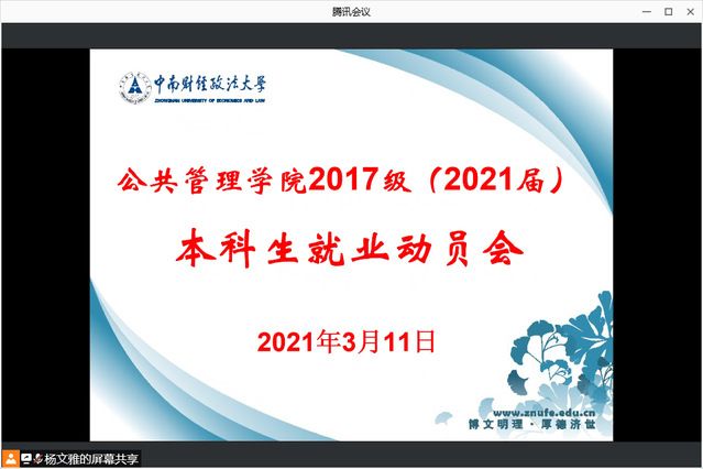 (通讯员:尹思语)为进一步做好应届毕业生就业工作、帮助广大学子深入了解就业形势和就业政策、指导毕业生正确择业,3月11日上午,公共管理学院召开2021届本科生就业动员视频线上会议,莅临本次会议的嘉宾有学校就业指导服务中心职业生涯咨询师肖力玮、蓝月亮(中国)有限公司校园招聘主任张永欢,辅导员黄勤老师及2017级全体本科生参会。 会议第一项,学校就业指导服务中心职业生涯咨询师肖力玮向大家做2021年就业形势分析的专题讲座。肖力玮老师首先通过大数据分析中南大2020届毕业生的整体就业情况,从就业去向、各学院就业率、就业行业分布等依次展开讲解。其次,肖老师就毕业生未就业原因进行了深入剖析,并结合历年高校毕业生人数及增长情况、各行业用人需求等数据分析了毕业生就业形势。肖老师总结近年来毕业生的就业特点指出,目前不打算就业的毕业生群体集中在考研二战、公务员考试两个类型,鼓励大家理性分析升学及公务员考试的成功率,树立科学正确的职业观。最后,肖老师强调了职业规划的重要性,介绍了择业期的概念及政策内涵,并结合生涯彩虹图建议应届毕业生尽早确立职业目标、明确职业兴趣,通过努力将职业理想化为直接现实。除此之外,肖老师解读了应届生相对于往届生的就业优势,并针对毕业生就业“四个误区”依次进行讲解,希望学生合理调整期望值。