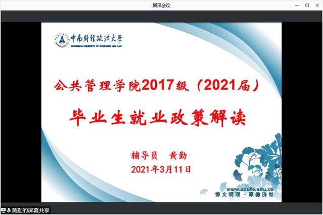 (通讯员:尹思语)为进一步做好应届毕业生就业工作、帮助广大学子深入了解就业形势和就业政策、指导毕业生正确择业,3月11日上午,公共管理学院召开2021届本科生就业动员视频线上会议,莅临本次会议的嘉宾有学校就业指导服务中心职业生涯咨询师肖力玮、蓝月亮(中国)有限公司校园招聘主任张永欢,辅导员黄勤老师及2017级全体本科生参会。 会议第一项,学校就业指导服务中心职业生涯咨询师肖力玮向大家做2021年就业形势分析的专题讲座。肖力玮老师首先通过大数据分析中南大2020届毕业生的整体就业情况,从就业去向、各学院就业率、就业行业分布等依次展开讲解。其次,肖老师就毕业生未就业原因进行了深入剖析,并结合历年高校毕业生人数及增长情况、各行业用人需求等数据分析了毕业生就业形势。肖老师总结近年来毕业生的就业特点指出,目前不打算就业的毕业生群体集中在考研二战、公务员考试两个类型,鼓励大家理性分析升学及公务员考试的成功率,树立科学正确的职业观。最后,肖老师强调了职业规划的重要性,介绍了择业期的概念及政策内涵,并结合生涯彩虹图建议应届毕业生尽早确立职业目标、明确职业兴趣,通过努力将职业理想化为直接现实。除此之外,肖老师解读了应届生相对于往届生的就业优势,并针对毕业生就业“四个误区”依次进行讲解,希望学生合理调整期望值。