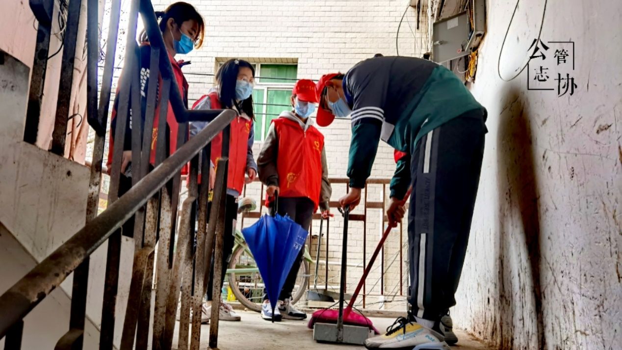 当日正值雨天,志愿者们准时来到了利济社区党员群众服务中心,分发、领取扫帚、畚斗等工具后,与利济社区服务中心的负责人一起出发,前往社区楼道开展清扫活动。