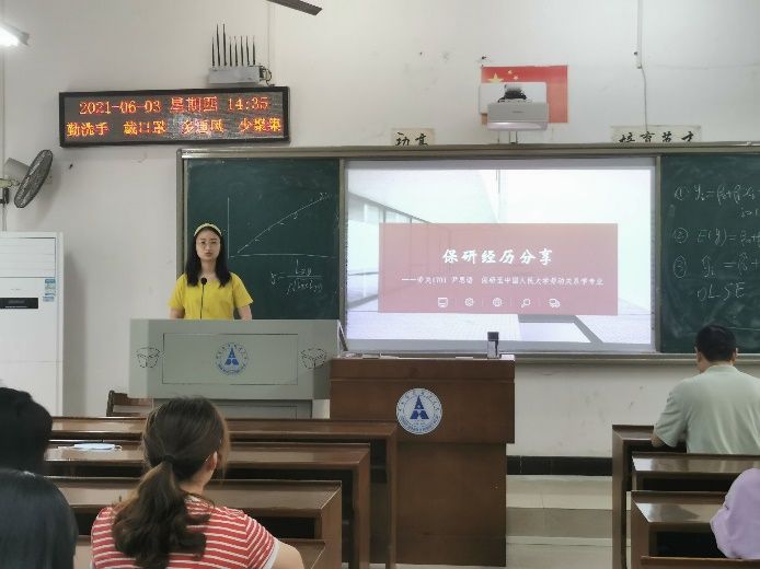 新闻网讯(学生记者 贾璇 摄影 曹瑾妍)2021年6月3日下午两点半,劳动关系专业保研考研经验分享会在文澜104教室成功举办,我院劳动与社会保障系主任、劳动关系1901班级导师熊卫与劳动关系1901班全体学生参加了本次经验分享会。为了使大二学生对保研考研相关信息有更加清楚的认知、增强他们对保研考研的信心,熊卫老师特邀劳动关系1701班尹思语、廖妮娜、刘安逸三位优秀毕业生作为主讲人进行经验分享。