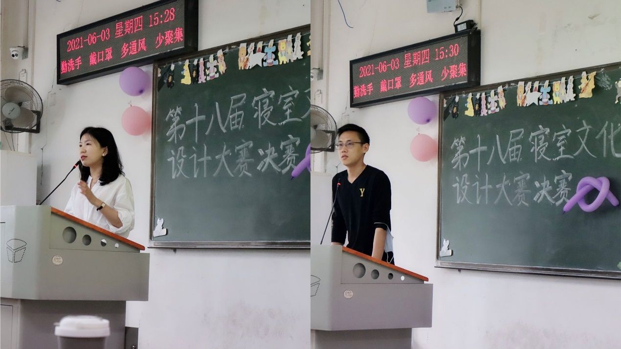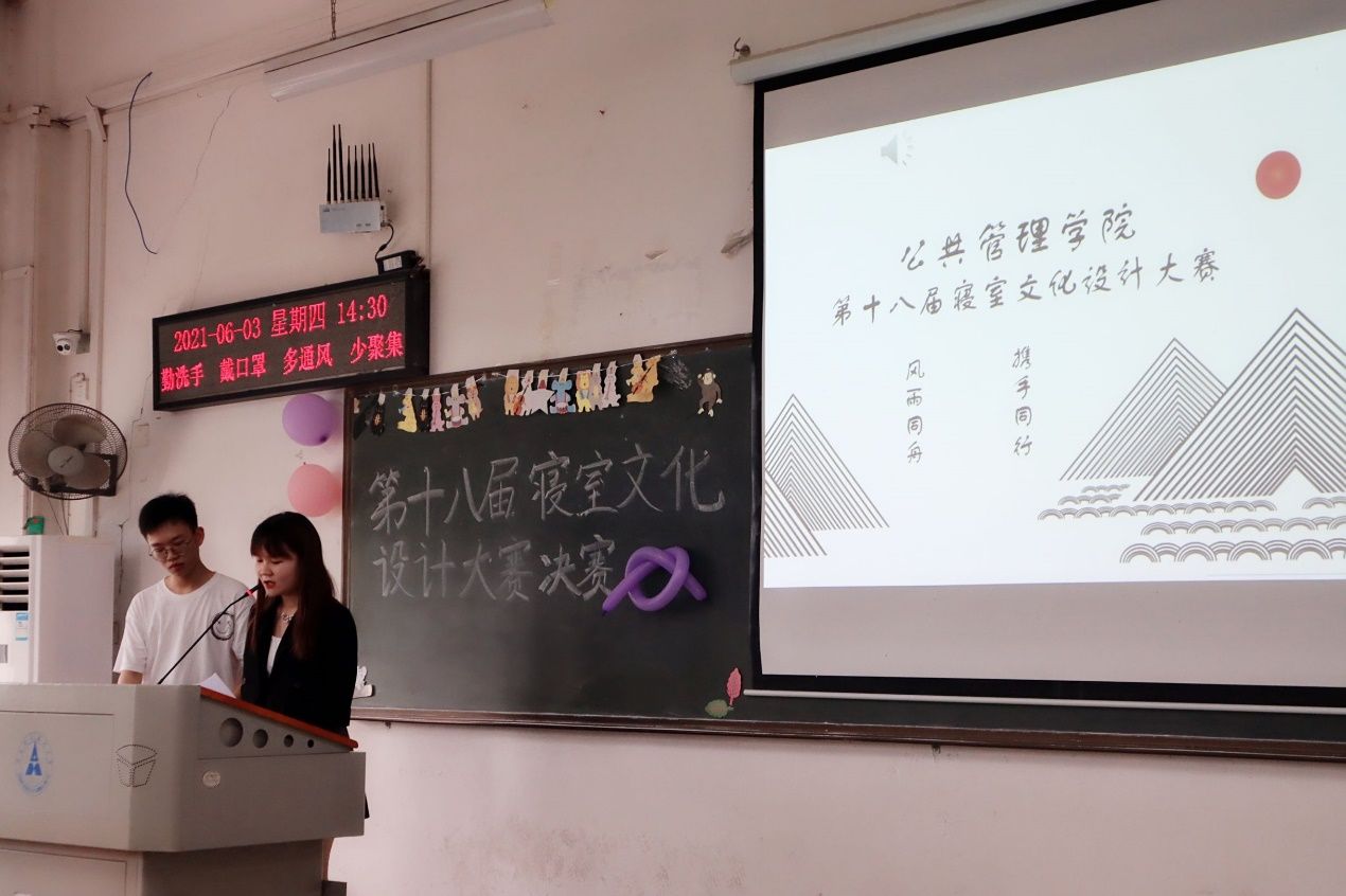 新闻网讯 (学生记者 毛玺祥 摄影 张雨萌)2021年6月3日下午两点三十分,公共管理学院第十八届寝室文化设计大赛决赛在文澜308成功举办。莅临决赛现场的嘉宾有公共管理学院城市管理专业讲师,兼职团委副书记赵颖智老师,公共管理学院本科生19级辅导员张黎明老师,实习辅导员崔雨凡老师,学生团委副书记王泓兮,学生会主席团成员孙健昆和童庆。