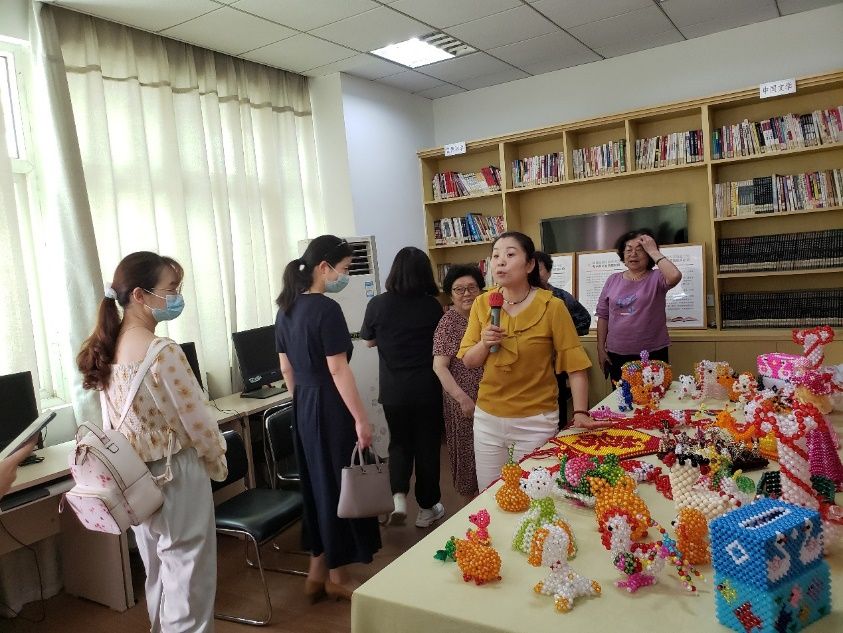 我们一行人刚下车就受到社区党委书记和工作人员的热情招待。社区在党建引领下创建了“银发先锋”党建品牌,并培育了29个志愿服务组织。来到社区活动室,那里有很多老党员、老干部为记录抗疫、学习党史创作的作品,也有巧姐姐志愿服务队制作的手工艺品,用一珠一线来编织公益。正是这些志愿者团队成为社区治理的重要力量,为社区改造、困难家庭帮扶和老幼照看提供了支持。