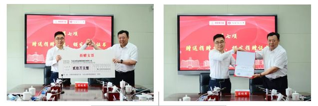 李加林书记向我校赠送捐赠支票,闫平常务副理事长向马应龙药业集团股份有限公司授予《捐赠证书》,感谢马应龙药业集团股份有限公司对学校教育事业的支持和帮助。