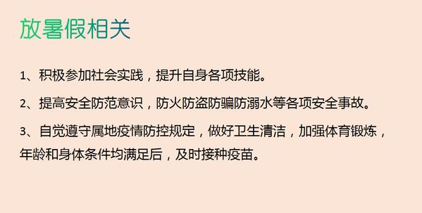 随后,李荔老师结合前段时间热点新闻,给大家做了安全警示教育,提醒各位同学们在暑期一定要提高安全防范意识,注意防火防盗防骗防溺水等各项安全事故;自觉遵守属地疫情防控规定,做好卫生清洁,加强体育锻炼,在年龄和身体条件均满足后,及时接种新冠疫苗。