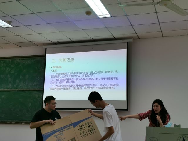 会议进行到第三项议程,李荔老师详细讲解了2020级本科生从首义校区搬迁到南湖校区的若干事宜,包括搬迁工作流程、各项物资准备、行李打包方法、标签书写格式、打包要求及禁运物品、其他注意事项等。为了让大家更直观的了解这些内容,李荔老师邀请公管2001班两名班委手持纸箱和编织袋给全体同学演示如何封箱,如何装箱,如何贴标签,如何捆扎带等,师生三人生动的展示和风趣的语言引得现场阵阵欢笑,也使大家对于行李打包和搬迁留下来深刻的记忆。