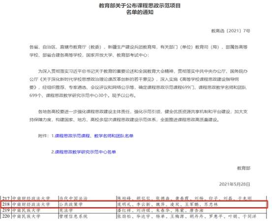 2021年6月,教育部公布了首批课程思政示范项目名单,我院《公共政策学》入选“课程思政示范课程”,《公共政策学》教学团队入选“课程思政教学团队”,课程负责人庞明礼教授被评为“课程思政教学名师”。