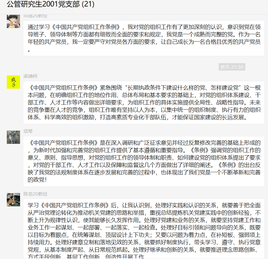 通过此次学习,全体党员一致领悟了《中国共产党组织工作条例》对于坚持和加强党对组织工作的全面领导、深入贯彻新时代党的组织路线、推进组织工作科学化制度化规范化、全面提高组织工作质量的重要意义;认识到《中国共产党普通高等学校基层组织工作条例》对于全面贯彻党的教育方针,落实立德树人根本任务,建设高质量教育体系,培养社会主义建设者和接班人的重要意义。大家一致认为要以《条例》的要求为标准,努力成为党和国家事业长远发展所需要的新时代青年人才!