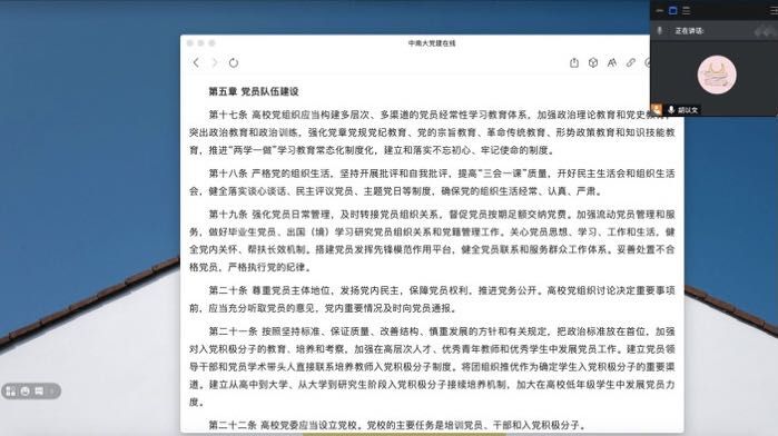 高校基层党组织是党在高校的战斗堡垒,党员是党的肌体细胞和党的活动主体,青年党员更是党组织中最为活跃的中坚力量。《条例》从政治教育、组织生活、管理服务、权利保障、发展工作五个方面对党员队伍建设提出了明确要求。支部书记胡以文表示,自从进入研三学年,支部成员都面临着毕业论文以及实习工作等一系列问题,任务繁重且时间紧张,据此支部会尽量灵活安排活动时间和形式,但同时不可降低活动质量,督促成员认真严肃对待每一次的组织活动。随后继续强调,新一批的预备党员需把政治标准放在首位,严守初心使命,锤炼党性修养,在获取党员身份荣誉的同时,也需自觉担起责任和义务,不辜负党组织的悉心培养。