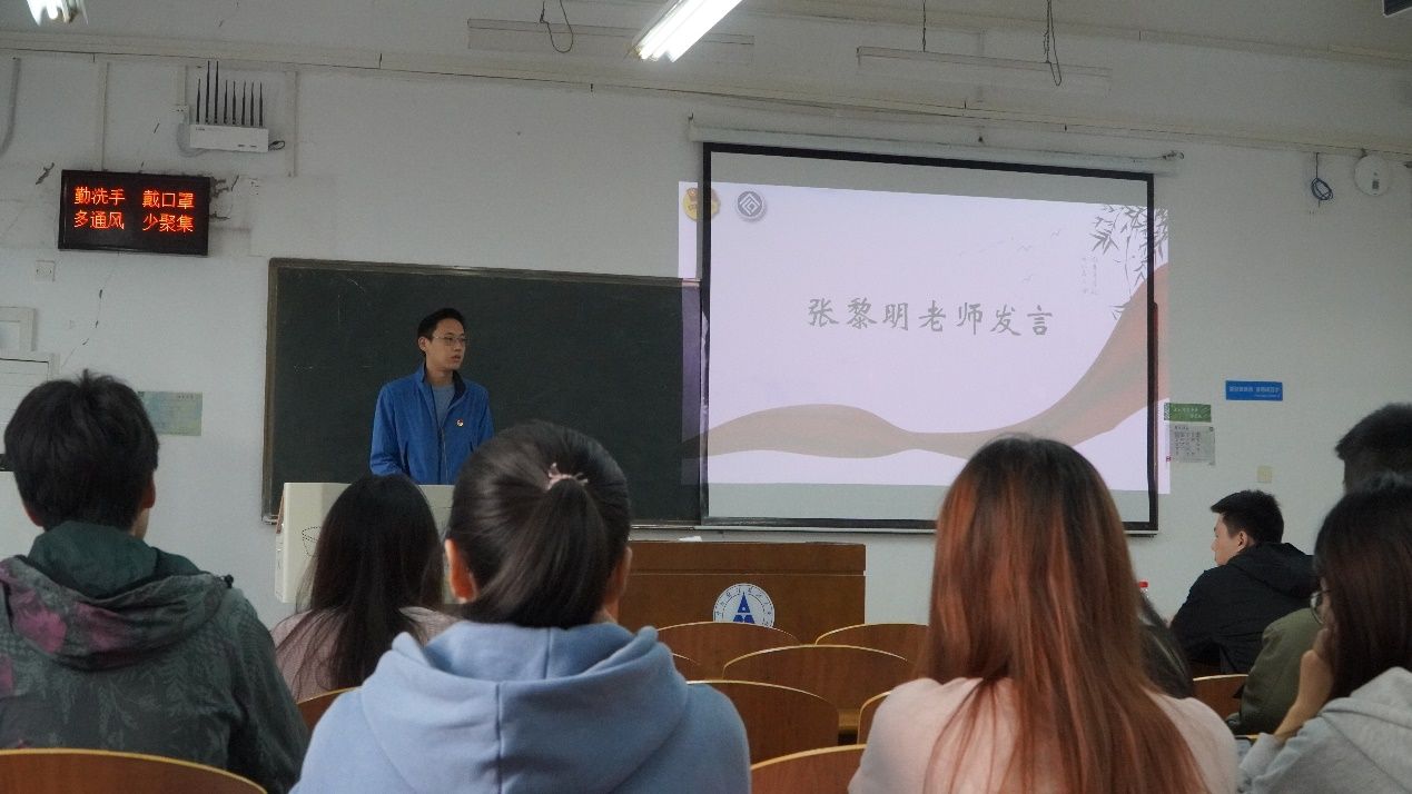 随后,张黎明老师进行了发言。他表示在接过团委工作的接力棒后,自己会继续带着崇高的使命,以更严格的标准要求自己。并希望今后整个团学队伍在院团委的指导下、在各位班团的不懈努力下能够更进一步。