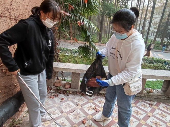 在认真聆听清扫要求之后,志愿者们开始分散进行活动。在活动过程中,志愿者们纷纷戴上手套、拿起夹子细心进行清扫,不放过每一个角落。面对藏在电教楼角落里的烟头和瓷砖缝隙里的糖纸,志愿者们耐心使用钳子、铁铲等清洁工具清理。虽然工作辛苦劳累,但本部记者在跟拍过程中仍然听到了许多欢声笑语,感受到了志愿清扫活动中同学们乐在其中的轻松氛围。