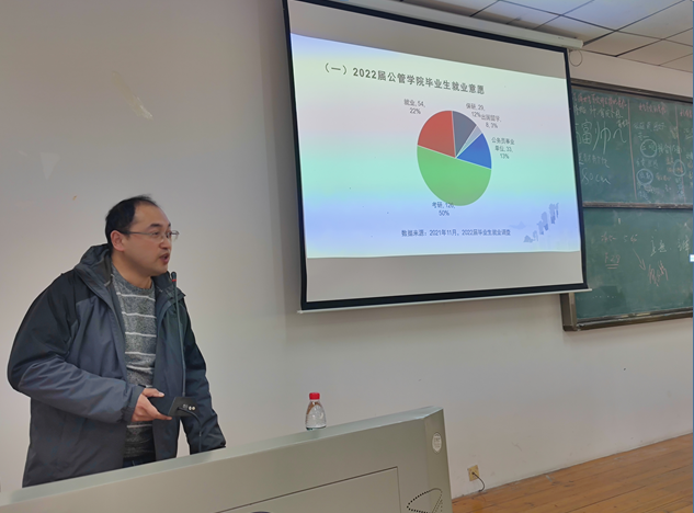 接下来肖老师结合社会调查结果和自己的心得体会,指出本科生需要对于未来的职业规划做出更早更充分的准备,并为同学们介绍了职业生涯规划的四个阶段,向同学们推荐了学校职业测评平台。随便,肖老师带领大家分析了目前大学生毕业后考研、考公、企业就业三个不同去向的实际情况。他指出,目前考研竞争剧烈,学生“内卷”现象严重;公考中定向选调生政策值得关注;企业就业波动变化大,选择职业时须有长远目标避免职业危机。此外,肖老师还进一步向同学们深度剖析了大学生核心竞争力的提升方法,为契合就业市场对于“职业化”、“复合型”人才的要求而提高综合素质,为成为社会的栋梁之才而未雨绸缪。
