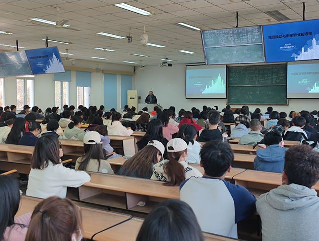 接下来肖老师结合社会调查结果和自己的心得体会,指出本科生需要对于未来的职业规划做出更早更充分的准备,并为同学们介绍了职业生涯规划的四个阶段,向同学们推荐了学校职业测评平台。随便,肖老师带领大家分析了目前大学生毕业后考研、考公、企业就业三个不同去向的实际情况。他指出,目前考研竞争剧烈,学生“内卷”现象严重;公考中定向选调生政策值得关注;企业就业波动变化大,选择职业时须有长远目标避免职业危机。此外,肖老师还进一步向同学们深度剖析了大学生核心竞争力的提升方法,为契合就业市场对于“职业化”、“复合型”人才的要求而提高综合素质,为成为社会的栋梁之才而未雨绸缪。