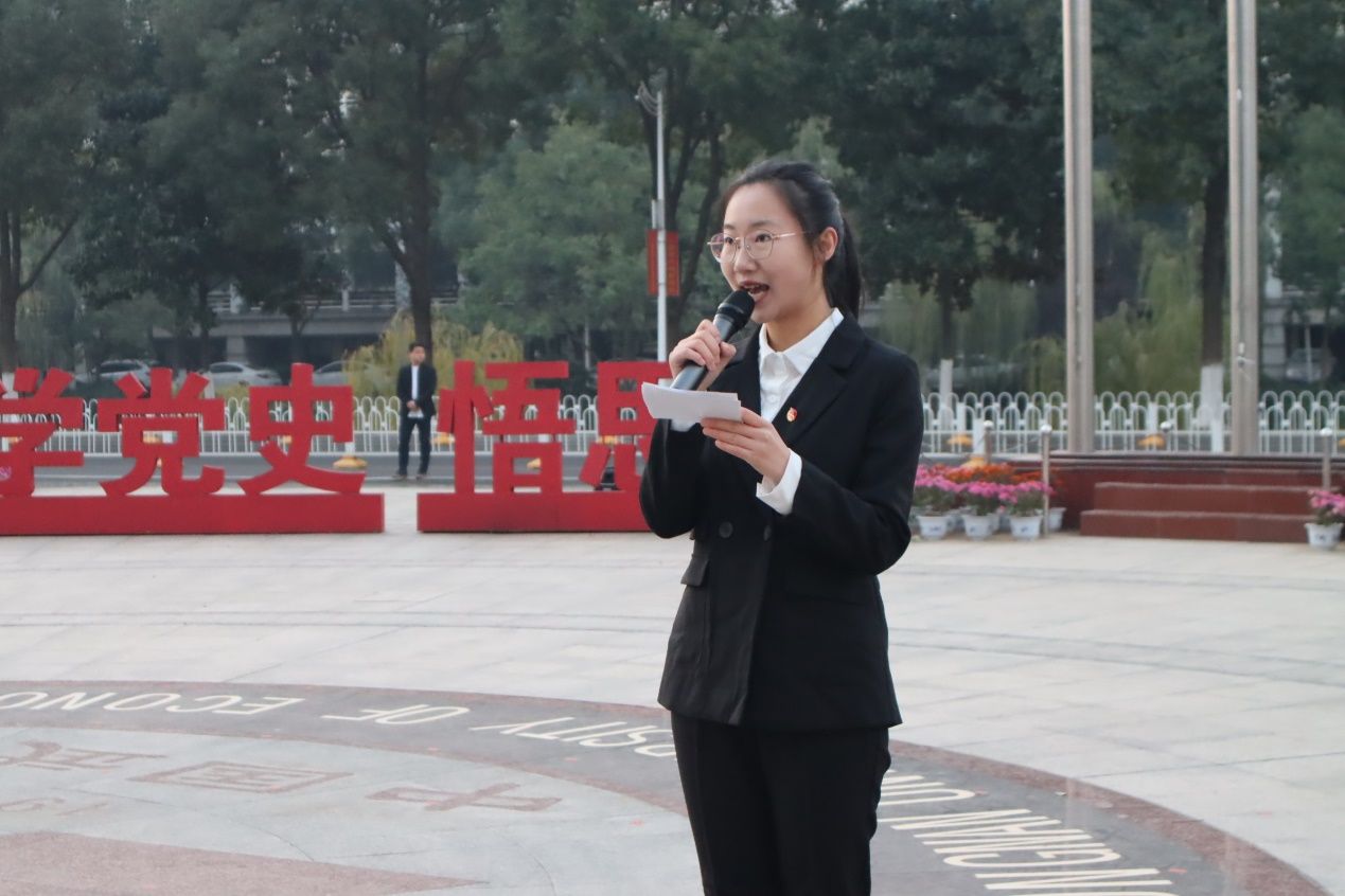 新闻网讯(学生记者 汪莹 摄影 张甜甜)11月29日上午7:00,朝阳欲升,公共管理学院“共悟六中全会精神,信念如故奋斗前行”升旗仪式在中原楼广场举行。我院全体入党积极分子、发展对象、预备党员和团学志骨干手持金黄的麦穗和鲜艳的红旗,组成“100”字样的百人方阵。莅临本次升旗仪式的领导和老师有:校学生工作部部长余小朋,公共管理学院院长张广科,院党委副书记刘茂盛,副院长李明强,院长助理李云新,以及学院全体本科生辅导员老师们。劳关2001班张珊珊同学主持升旗仪式。