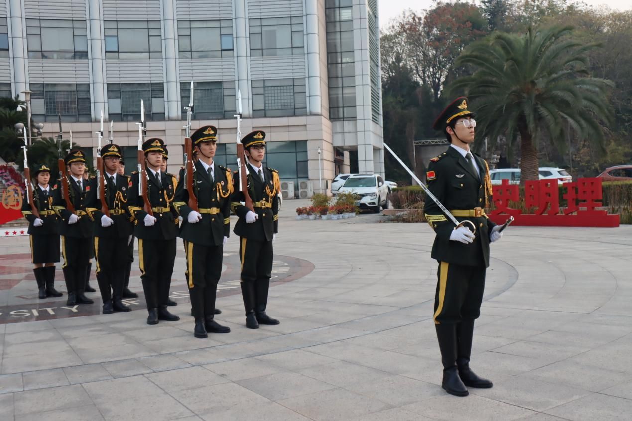 上午七点整,随着主持人一声宣示,升旗仪式正式开始。迎着冬日的第一束暖阳,升旗手迈着铿锵有力的步伐护送国旗走向升旗台,他们面容坚毅,挺拔玉立。在《义勇军进行曲》的激昂乐声中,鲜艳的五星红旗随着旭日冉冉升起,迎风飘扬。
