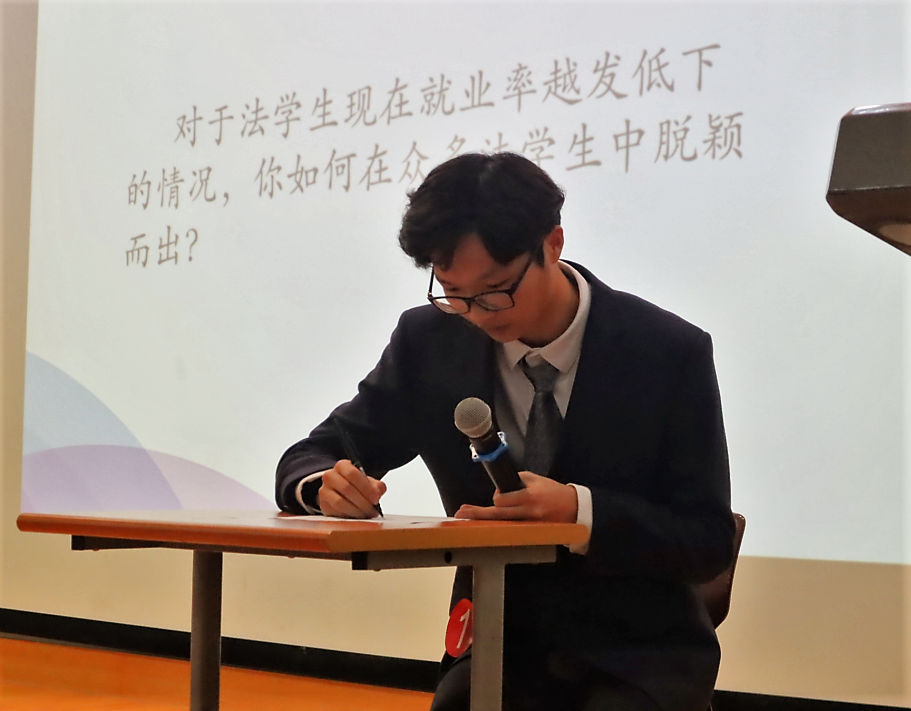 接下来进行情景模拟环节,这是一项极大考验知识储备量、临场应变能力以及语言组织水平的难关。选手们上台随机抽取问题,并在短短一分钟的思考时间后当场作答,还需面临评委老师的突击提问。在面对“当委托人对你有所隐瞒时如何进行沟通以获取有效信息”的难题时,法2013班秦祖会同学从法学专业的角度出发界定了委托的法律效应,以代理人身份对隐瞒问题的风险评估分析,充分展现了他出色的法律知识素养与理性思维能力。邵志勇老师对此问答高度赞扬,也中肯地补充到,与委托人沟通时也要加强业务之外的非正式沟通。