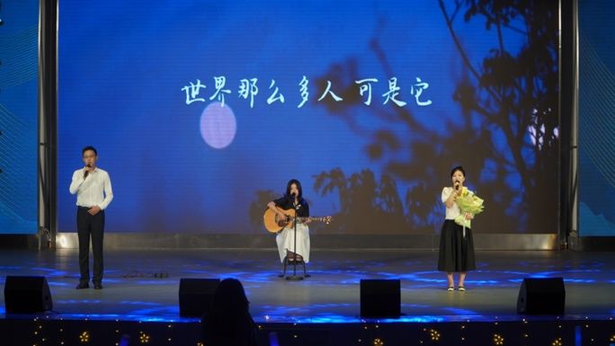 晚会正式拉开序幕,赵颖智老师、张黎明老师、吉他协会潘祥宇为我们带来了一首《这世界有那么多人》。 “灰树叶飘荡在池塘,看飞机轰的一声去远方”诗一样的歌词娓娓道来,送给即将踏上理想征途,面对未知风雨的毕业生,祝愿每一个人都能拥有美好的未来。