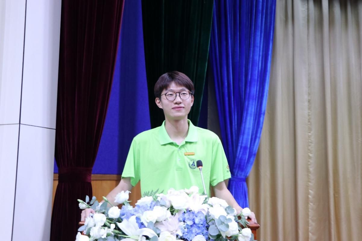 2022级社会保障专业林燚阳同学代表我院全体新生向师长和朋友致以诚挚的感谢和问候,他以“廿载芳华,爱在公管”为主题,从对学院与专业的钟爱、对公共管理学院所有老师的敬爱、对理想与目标的热爱三方面进行阐述。他表示,作为与新时代同向同行、共同前进的一代,就让我们保持最初的热情,怀揣远大的理想,牢记“博文明理,厚德济世”的校训,秉持 “上进、知止、守正、创新”的公共管理精神,共铸公管荣光,吾辈义不容辞!