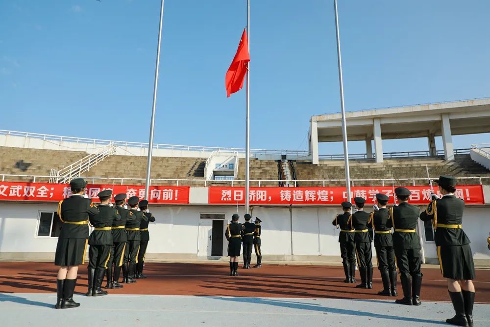 开学典礼在雄壮的国歌声中拉开序幕,全体起立,奏唱国歌,举行升国旗仪式。