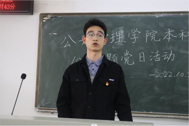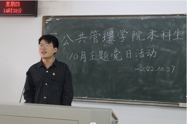 新闻网讯(学生记者 张甜甜 摄影 李昊阳)2022年10月27日14时30分,米兰电竞·(中国区)公共管理学院本科生10月主题党日活动于文澜306教室举办,我院本科生2019级、2020级全体预备党员以及2021级全体发展对象参加此次党日活动。同志们皆胸佩党徽,肃穆入场,深入学习二十大精神。此次大会由张如许同志主持。