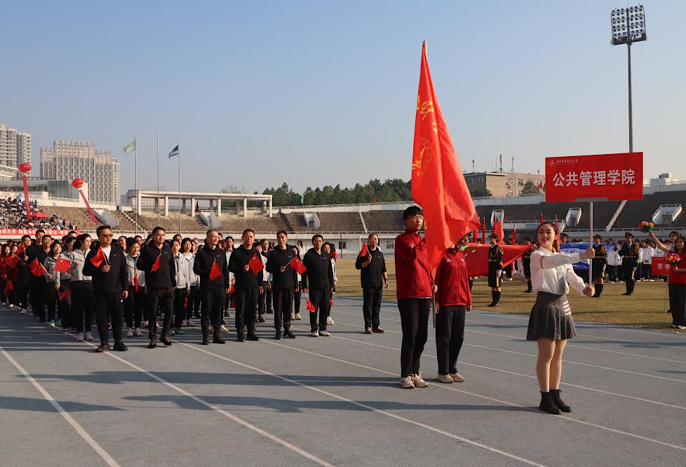 开幕式上我院师生代表方队穿着统一的服装,手持鲜红的旗帜,每个人昂首屹立于队列中,神采奕奕、英姿勃勃。他们朝气蓬勃,凝聚着不竭的活力;他们英姿飒爽,展现着公管师生激扬的热情。“威武公管,逐鹿中南,气宇轩昂,勇创辉煌!”铿锵有力的口号声响彻整个运动场,充分展现了我院师生奋勇向前、迸发共进的精神风采,喊出了我院师生不惧艰险、迎难而上的精神风貌。