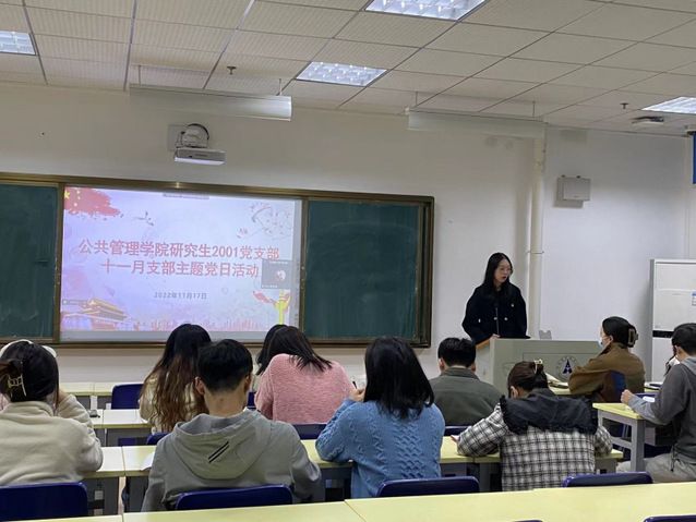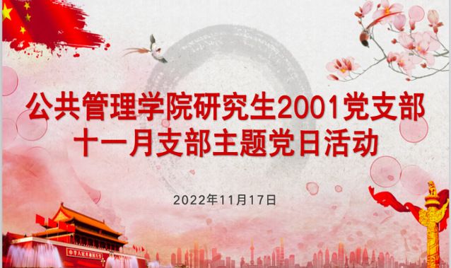 (通讯员 翟慧芳)为深入学习领会党的二十大精神,准确学习把握疫情防控新政策,公共管理学院研究生2001党支部于11月17日晚上,在文澴楼515教室开展“守正创新担使命,勇毅前行谱新篇”十一月支部主题党日活动,活动采取线上线下相结合的方式开展。此次活动由支部第四党小组主持筹备。