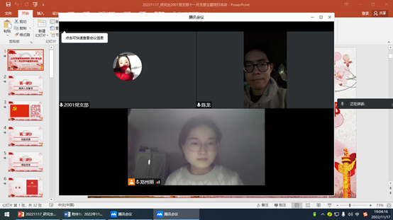 首先,周未雨同志带领全体党员重温入党誓词。接着,支部组织委员赵欣雨同志在线上收取十一月份党费。随后,项琴同志带领大家诵读并学习了《中国共产党章程》的总纲内容,着重讲解了新《中国共产党章程》与旧《中国共产党章程》的不同之处。紧接着,活动进入到政治理论学习环节:周未雨同志带领大家重点学习了《中共中央关于认真学习宣传贯彻党的二十大精神的决定》、《习近平主持中央政治局常委会会议 听取新冠肺炎疫情防控工作汇报 研究部署进一步优化防控工作的二十条措施》;郑州丽同志在线上带领大家一起研读了《关于进一步优化新冠肺炎疫情防控措施 科学精准做好防控工作的通知》、《习近平在陕西延安和河南安阳考察时强调 全面推进乡村振兴 为实现农业农村现代化而不懈奋斗》;韦春玲同志带领大家共同学习了《习近平:坚持把解决好“三农”问题作为全党工作重中之重,举全党全社会之力推动乡村振兴》。