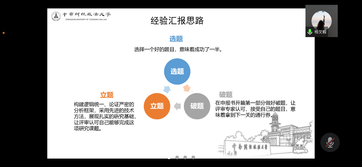 杨文毅老师于2021年6月获得武汉大学区域经济学博士学位,同年7月入职米兰电竞·(中国区)公共管理学院行政管理系,在2022年同时获批了国自科青年基金和教育部人文社科青年基金。她结合自身项目申报经验,从选题、破题、立题三个方面介绍了自己的项目申报心得。第一步是选题,选择一个好的题目,意味着成功了一半,好的选题应具备突出的理论创新性并切中现实需求。第二步是破题,在申报书开篇第一部分做好破题,赢得评审专家认可,意味着拿到下一关的通行券。就国自科基金申报而言,立项依据的撰写十分重要,立项依据是展示项目主要内容、创新性、先进性和研究意义的第一个机会,评审专家通过阅览立项依据就会去掉一半以上的申请书。第三步是立题,设计严密统一的逻辑框架,确立清晰详实的研究内容。在研究基础部分突出个人特色,不断修改提升本子质量。最后,杨文毅老师通过自己的经历鼓励并预祝各位青年老师都能在未来的项目申报中披荆斩棘、获取佳绩。