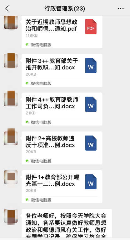 4月27日,系主任陈美老师线上召集老师们学习了《教育部公开曝光第十二批7起违反教师职业行为十项准则典型案例》、《教育部关于推开教职员工准入查询工作的通知》和《高校教师违反十项准则高发问题警示教育案例》等材料,强调要以《新时代高校教师职业行为十项准则》和“高校教师师德红七条”作为不可逾越的底线,志存高远,为人师表,做无愧党和人民的高校教师。老师们认真学习各项材料,并在线上对学习心得进行了交流汇报。