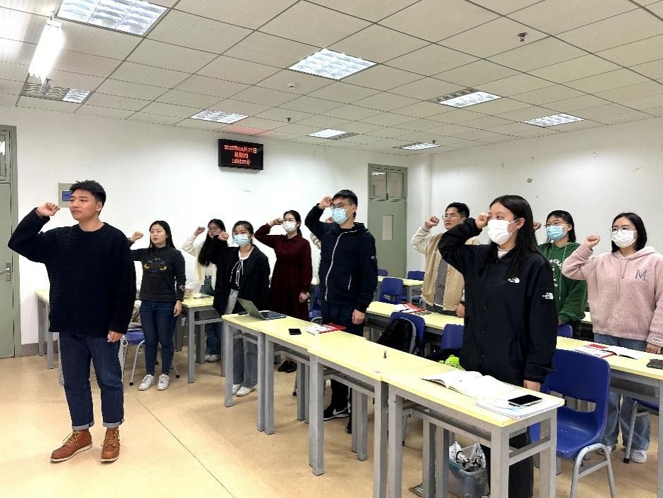 研究生2203党支部于4月26日晚,在文澴楼520教室开展“读·讲·行”主题党日活动,会上,由主持人盛文星同志向全体参与人员介绍了此次党日活动开展的核心主题和主要环节。活动主要分为四个环节,分别是重温入党誓词、收缴党费、专题学习和小组互动。