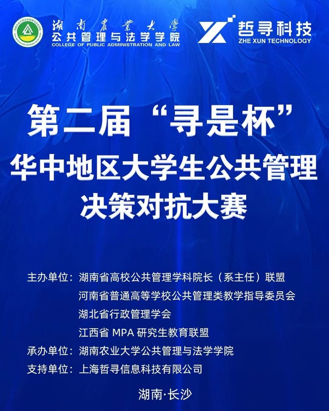 第二届“寻是杯”华中地区大学生公共管理决策对抗大赛于2023年6月10日正式启动,大赛是面向湖北、湖南、河南和江西四省的公共管理学科相关本科专业在校大学生的专业竞赛项目。大赛由湖南农业大学主办,湖南省高校公共管理学科院长联盟、湖北省行政管理学会、河南省普通高等学校公共管理类教学指导委员会、江西省MPA研究生教育联盟联合主办,上海哲寻信息科技有限公司提供全面技术支持。自大赛发布通知以来,得到华中地区高校师生的广泛关注,共有45所高校,46支队伍参加比赛。