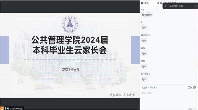 新闻网讯(学生记者张甜甜)为进一步加强家校沟通,拓宽家校沟通渠道,加深家长对当前就业形势及学院就业举措的了解,7月22日、23日晚,公共管理学院2024届本科毕业生云家长会准时召开,本科生2020级辅导员李荔主持会议,共计200余名家长参加。