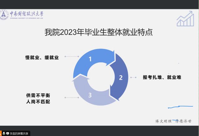在对当前就业形势的解读中,李老师从国家、地区、学校、学院多个层面多维度进行分析,用宏观数据和现实情况来阐述当今学生们的就业困境。她总结出三个我院毕业生整体就业特点:即慢就业、缓就业;供需不平衡、人岗不匹配;报考扎堆、就业难。李老师多次提醒家长,在现如今,考研考编宛如“千军万马过独木桥”,一定要让孩子审时度势,顺势而为。