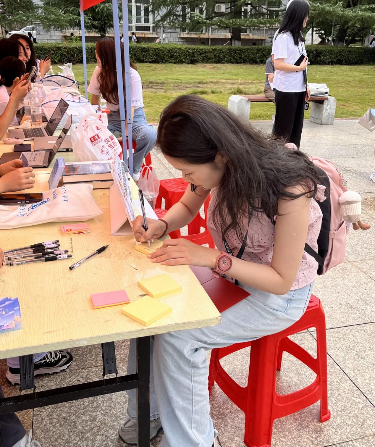 张广科院长为新生荐书签字,查看为新生悉心准备的活动明信片、暖心袋等,为志愿者们的饱满热情和精彩有序的报到活动点赞。