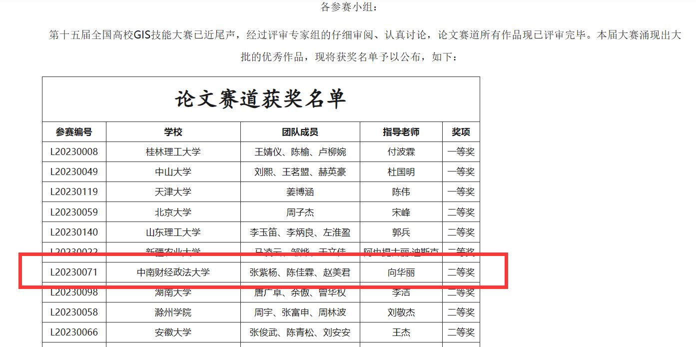 (通讯员:张紫杨)2023年10月31日,第十五届全国高校GIS技能大赛公示了论文赛道获奖名单。大赛旨在推动我国测绘地理信息事业实现转型升级的科学发展和GIS技术的深入应用,促进GIS相关专业改革,提升毕业生就业竞争力,向社会输送更多具有创新思维和实践动手能力的GIS的优秀人才。本届大赛由中国测绘学会、中国地理信息产业协会共同主办,国家地理信息系统工程技术研究中心、地理信息系统产业技术创新战略联盟协办,中地数码集团承办。大赛已成为中国GIS领域最具影响力的创新型赛事之一,受到了全国各大科研院校和行业的广泛关注。